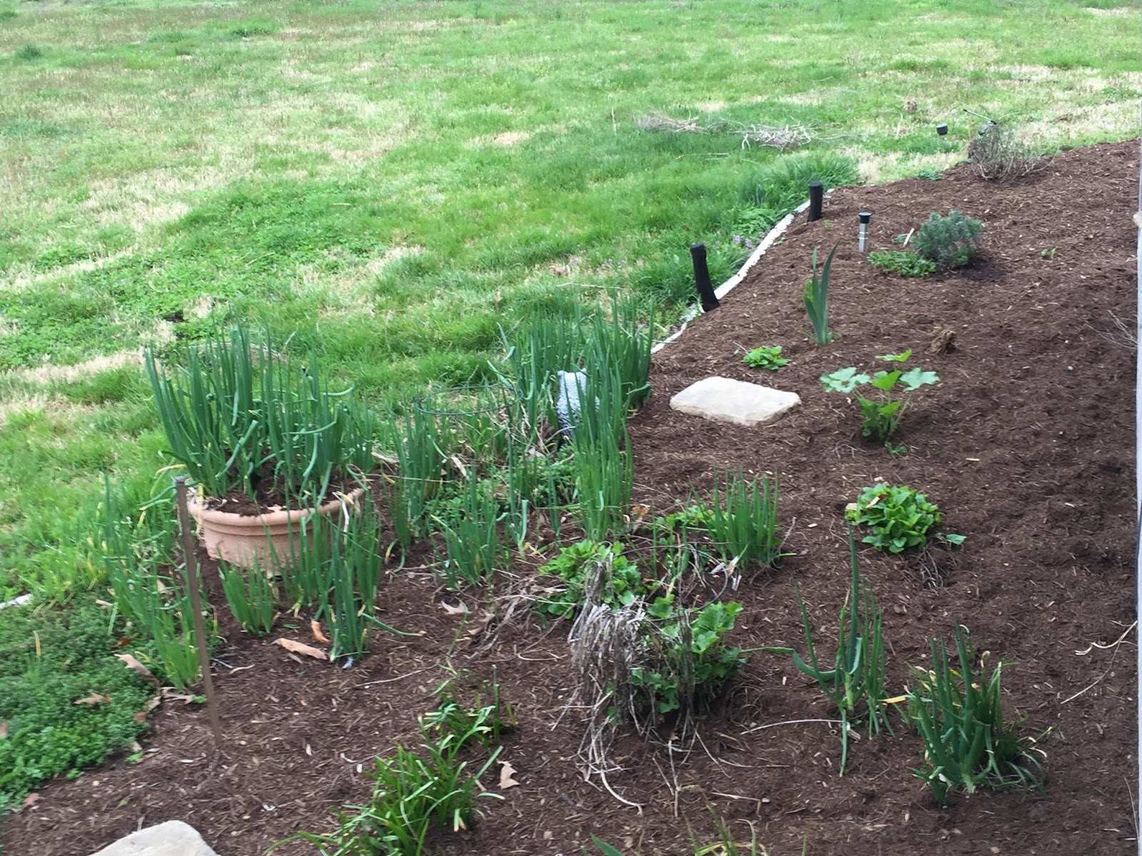 In the edible garden, onions, tarragon, garlic chives, mountain mint, asparagus, shallots, garlic and spearmint are all popping up in the garden bed and pots. Overwintering arugula, carrots, celery, winter cress, strawberry plants, raspberry plants, blackberry bushes, sprouting broccoli, thyme and oregano are growing again. Chickweed is flowering and growing vigorously. The garden is giving greens for fresh picked salads.
